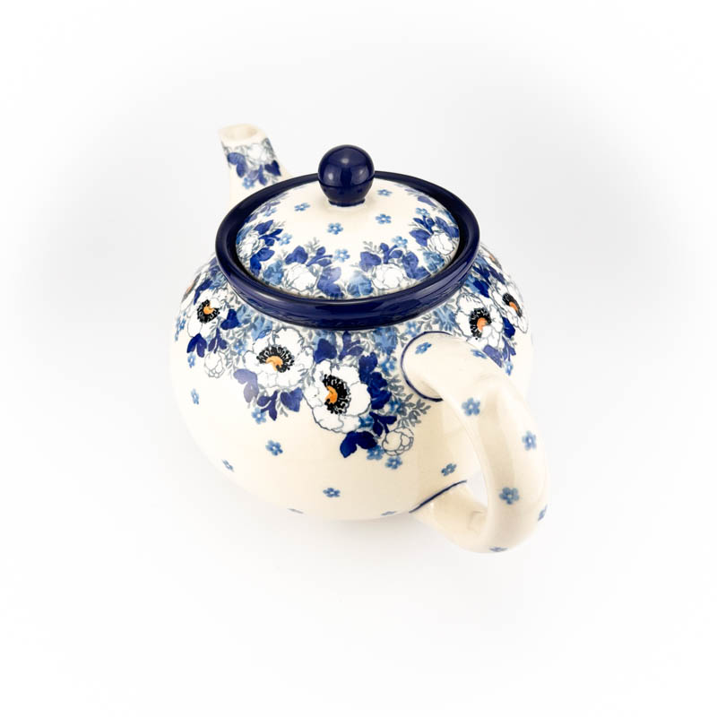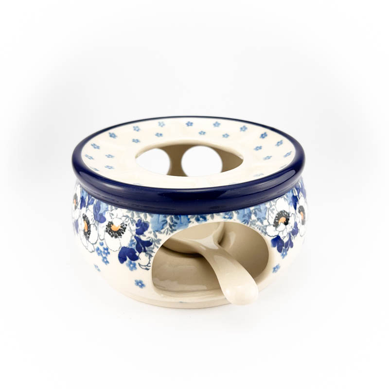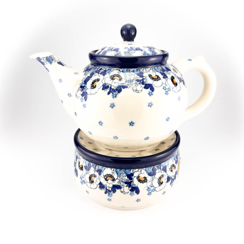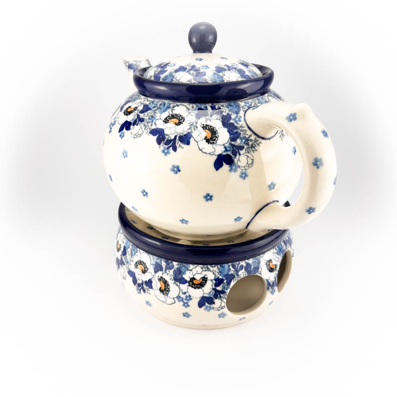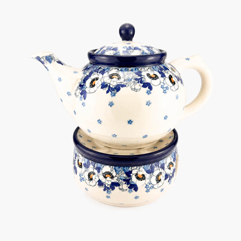 Czajnik z podgrzewaczem i łyżeczką na świecę. Pojemność 1,2 L. Wykonany z ceramiki Bolesławieckiej. Malowany ręcznie metodą stempelkową w popularny wzór anemony. Produkt polski.