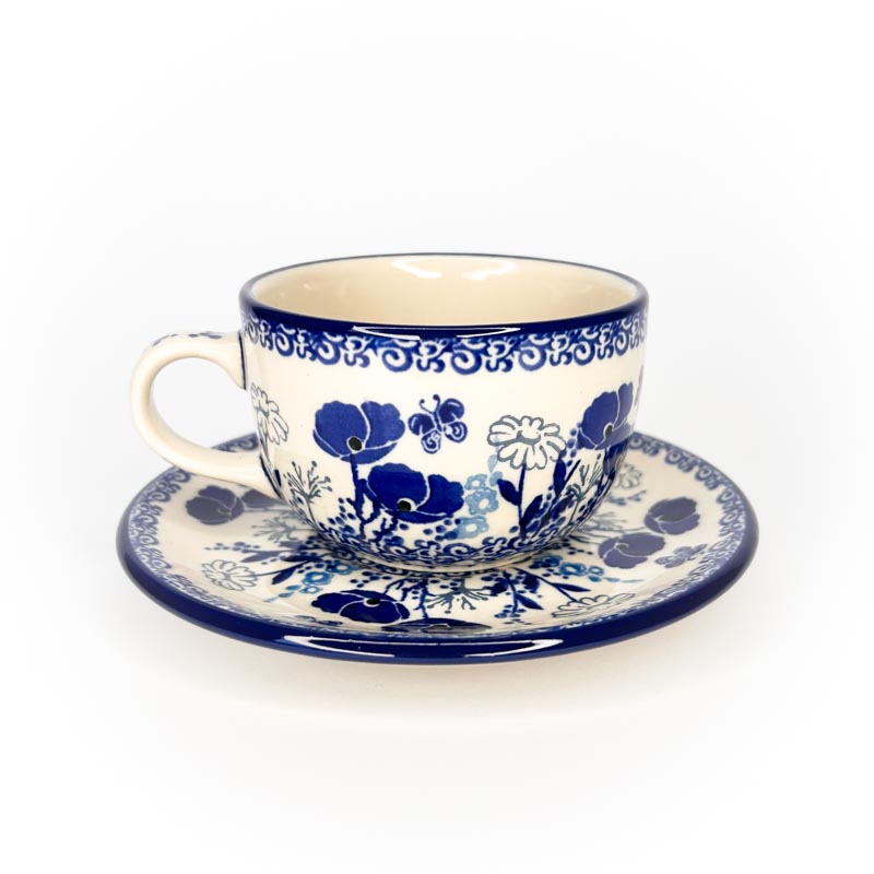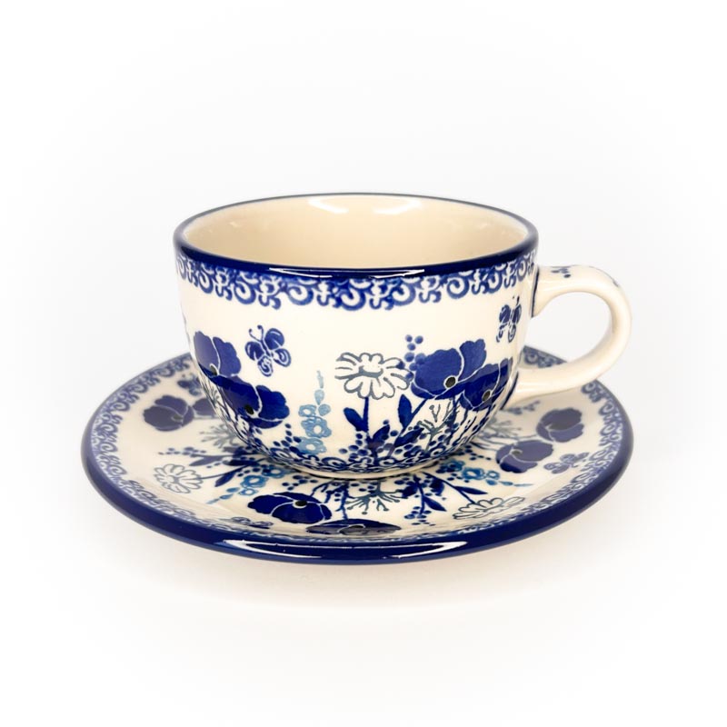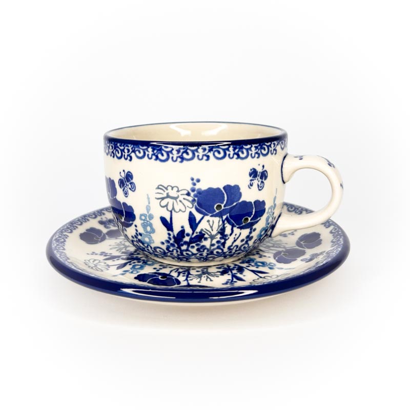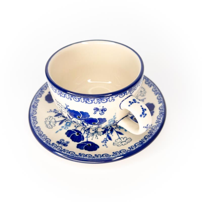 Filiżanka we wzorze w niebieskie kwiaty o pojemności 200 ml. Filiżanka ze spodkiem do kawy i herbaty.