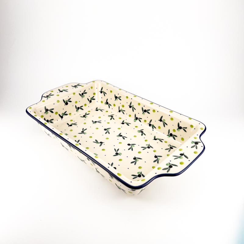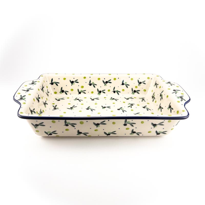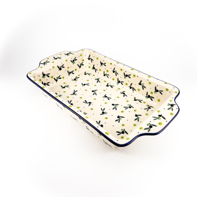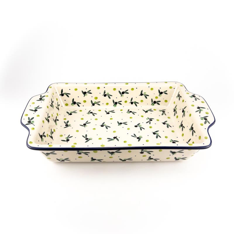 Dwufunkcyjna forma do pieczenia Bolesławiec: może służyć zarówno jako półmisek i naczynie do żaroodporne. Wymiary 33,5 cm x 19,5 cm wysokość 6 cm. Piękny ręcznie malowany wzór w śródziemnomorskie oliwki. Idealne naczynie do pieczenia różnego rodzaju potraw np. lasagne, zapiekanki makaronowe czy dania mięsne. Malowane ręcznie metodą stempelkową przez artystów z lokalnej Ceramiki Artystycznej. Oryginalna polska ceramika z Bolesławca. Produkt wykonany z naturalnych materiałów. Zapiekanka A59, wzór 2414X.