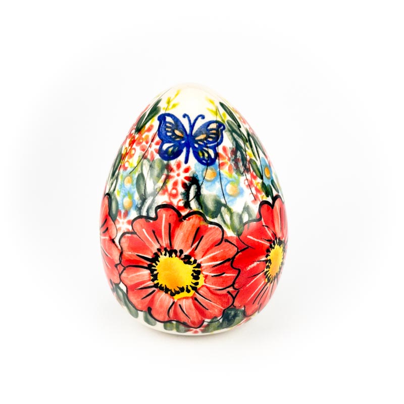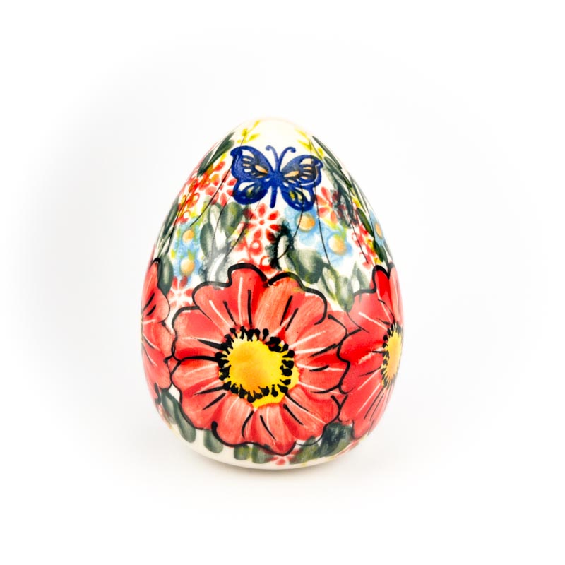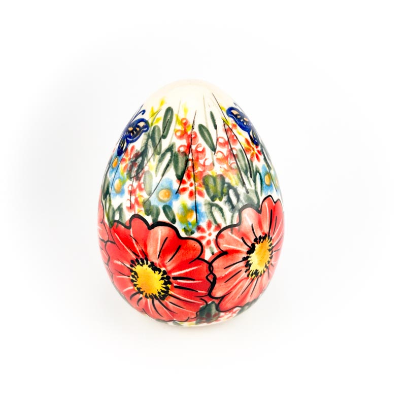 Jako o wysokości 10 cm. Pięknie malowane ręcznie we wzór czerwonych kwiatów i motyla. Unikat. Wyprodukowane przez Ceramikę Artystyczną Vena. Produkt polski.