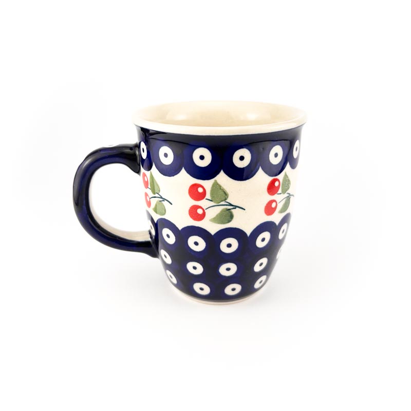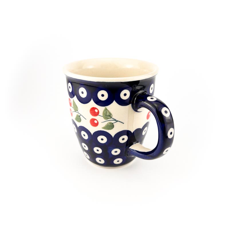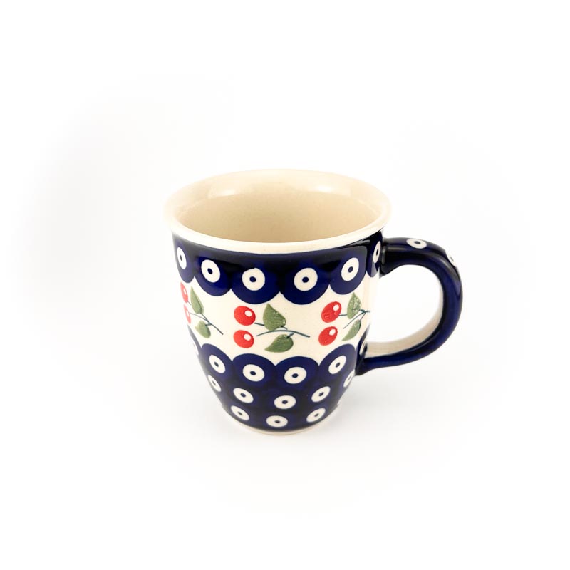 Kubek Bolesławiec, pojemność 300 ml. Kształt Mars – bardzo popularny i tradycyjny kształt kubka. Wykonany z oryginalnej ceramiki bolesławieckiej. Wzór tradycyjna kropki i czerwone wiśnie. Malowany ręcznie. Producent: Manufaktura w Bolesławcu. Produkt polski.