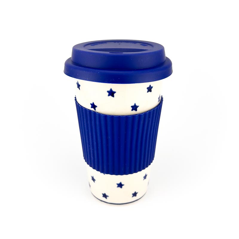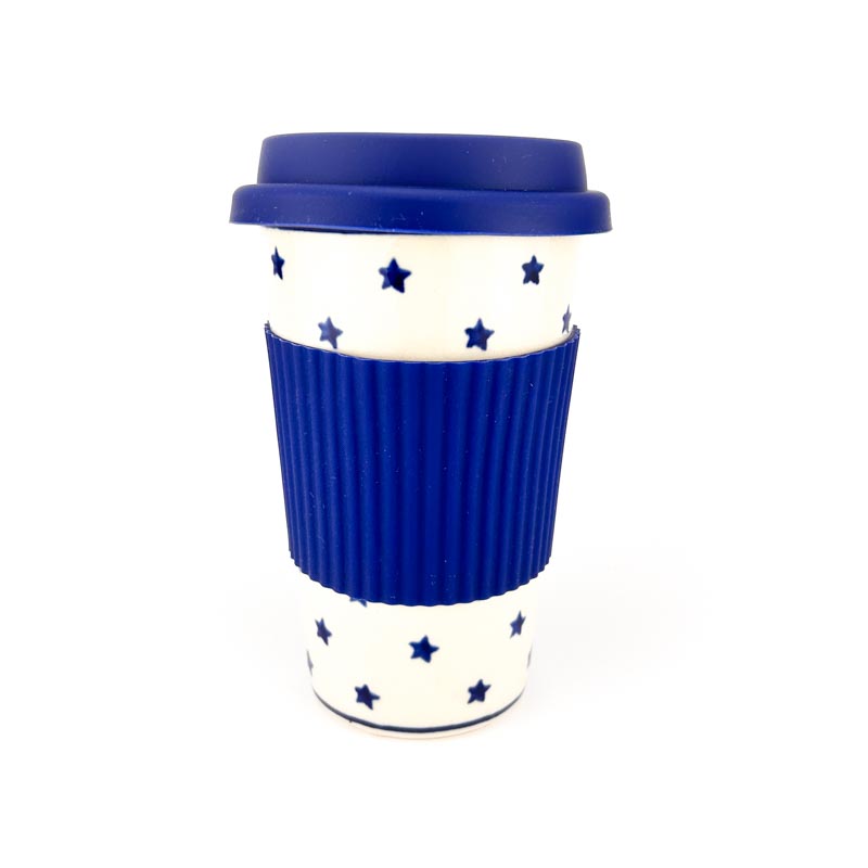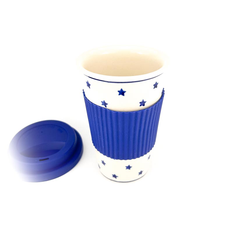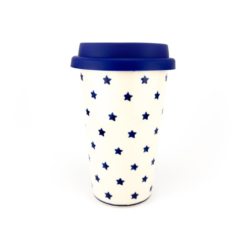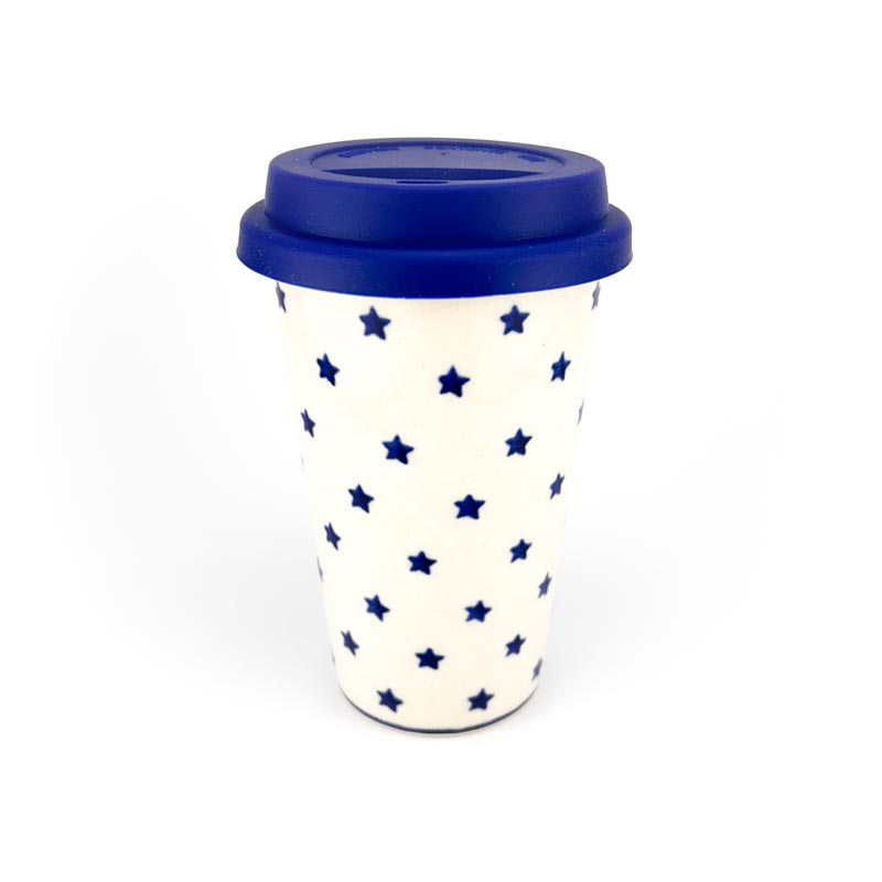 Kubek podróżny z motywem gwiazdek D47 wykonany z ceramiki Bolesławiec. Tradycyjna oryginalna bolesławiecka ceramika. Pojemność 300 ml. Wysokość kubka 15 cm. Malowany ręcznie. Producent Zakłady Ceramiczne Bolesławiec. Produkt polski. Wieczko i osłonka silikonowa na dłoń w zestawie (kolor granatowy). Gatunek 2 – mało widoczne łączenia szkliwa.