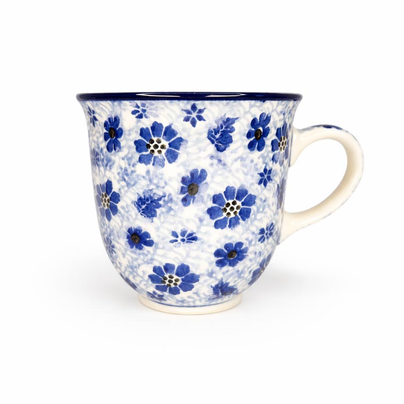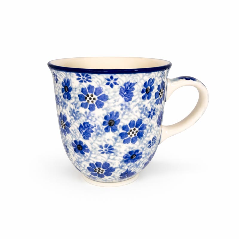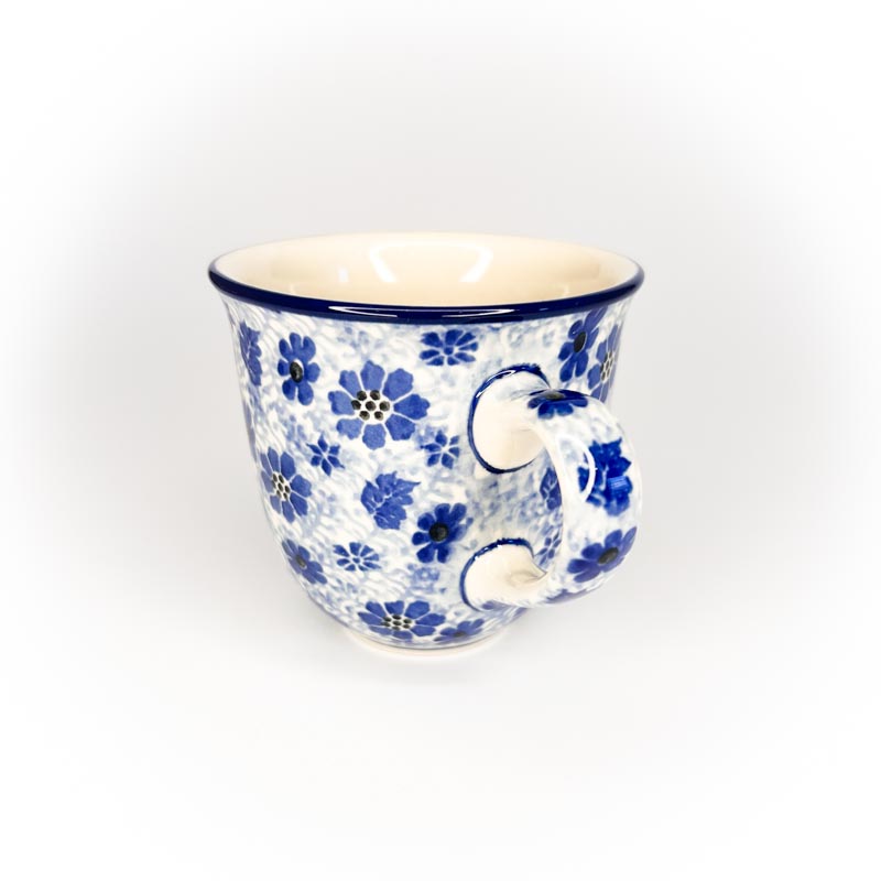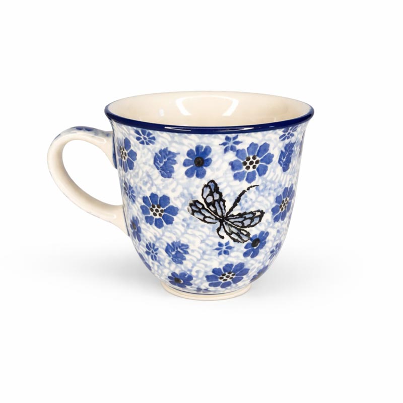 Ceramiczny kubek o pojemności 300 ml. Ręcznie malowany wzór w niebieskie kwiaty i ważkę. Producent Ceramika Artystyczna Bolesławiec.