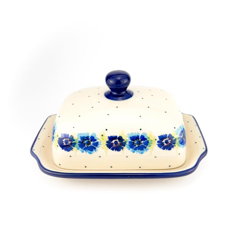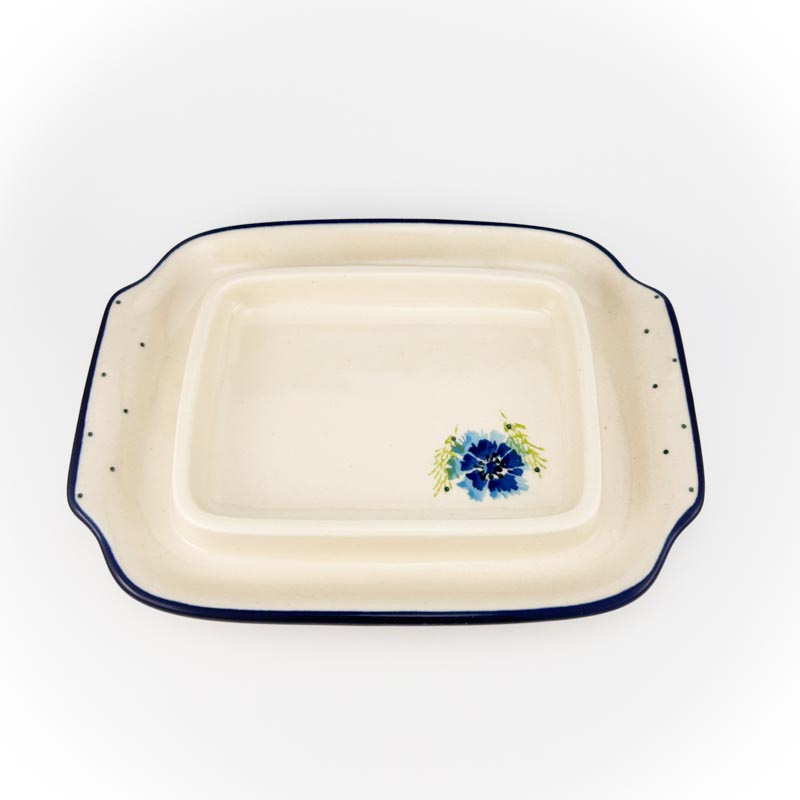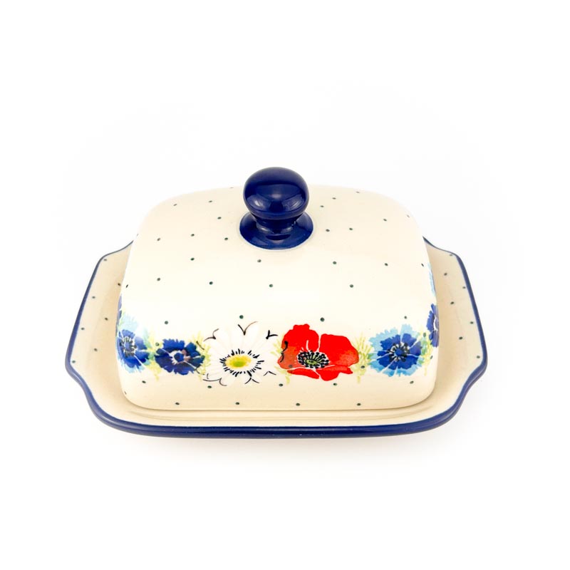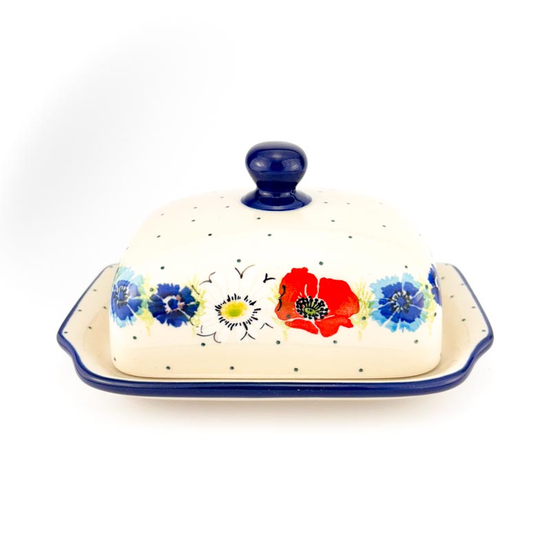 Elegancka maselnica o długości 18 cm z kolekcji „Kwiaty Polskie” to piękny i praktyczny element tradycyjnej ceramiki bolesławieckiej. Ręcznie zdobiona motywem polskich kwiatów, zachwyca klasycznym wzornictwem oraz harmonijną kolorystyką, która wprowadza do kuchni ciepły, rustykalny klimat.
