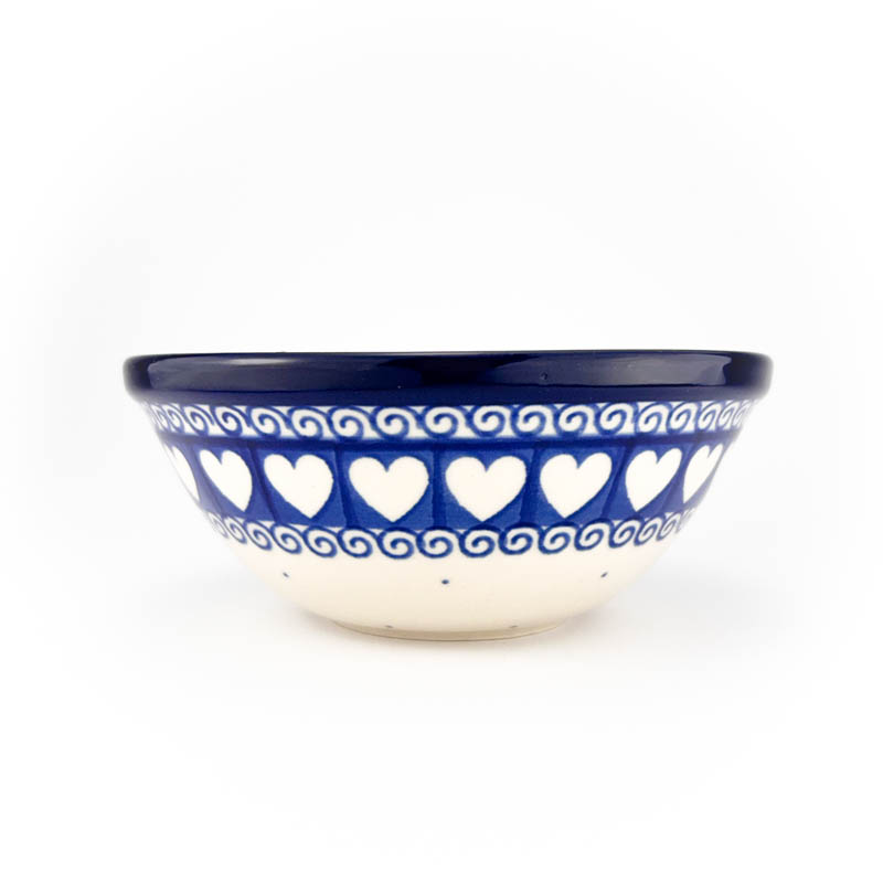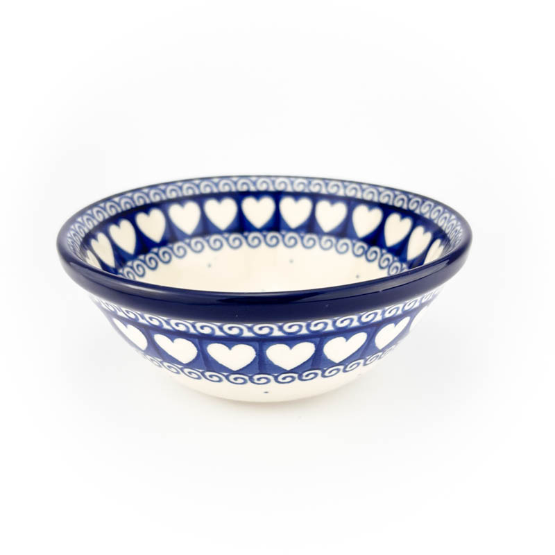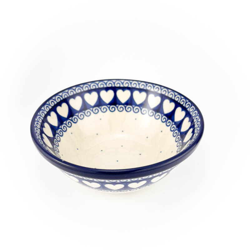 Urocza miska o średnicy 14.5 cm. Mała salaterka, można używać także do owoców, przystawek czy sosów. Model 059, wzór serca 0375M M. Ciszewska. Wykonana z naturalnej kamionki, malowana ręcznie. Produkt polski. Ceramika Artystyczna Bolesławiec.