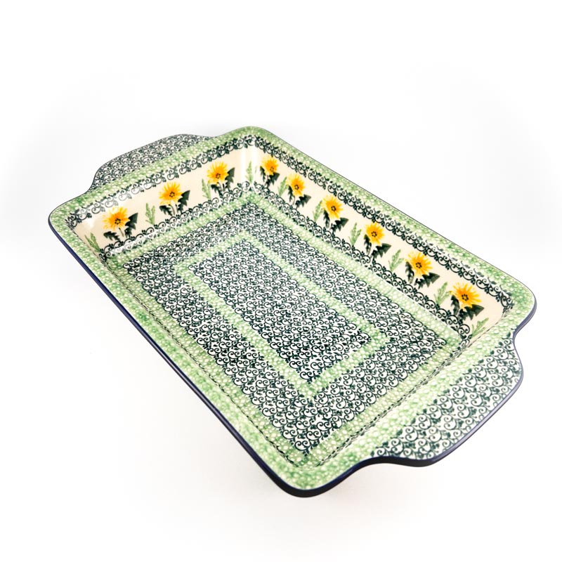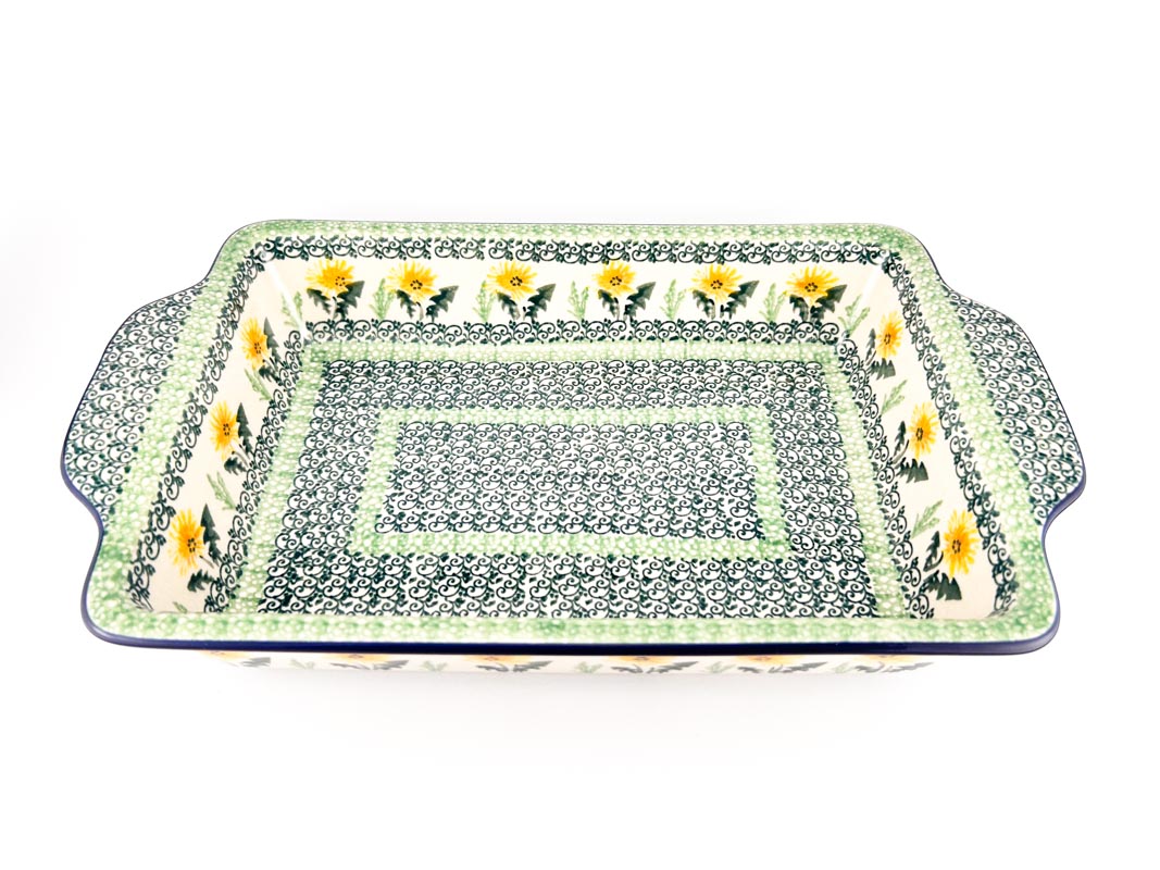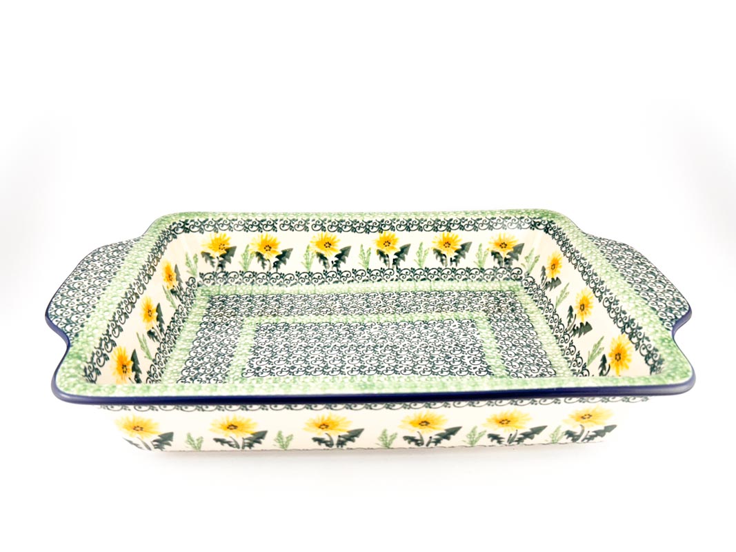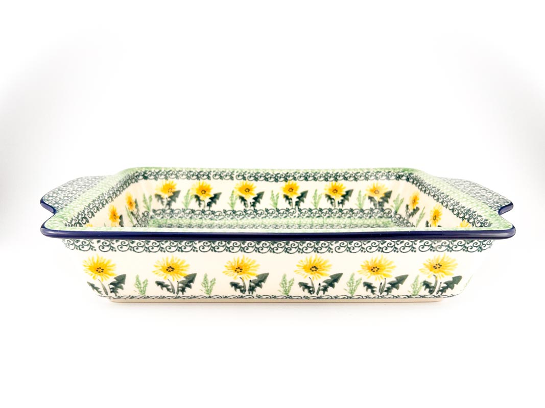 Funkcjonalna forma do pieczenia wykonana z ceramiki bolesławiec z wygodnymi uszami, zdobiona wzorem Mlecze 2638X. Idealna do zapiekanek, mięs, warzyw i deserów.