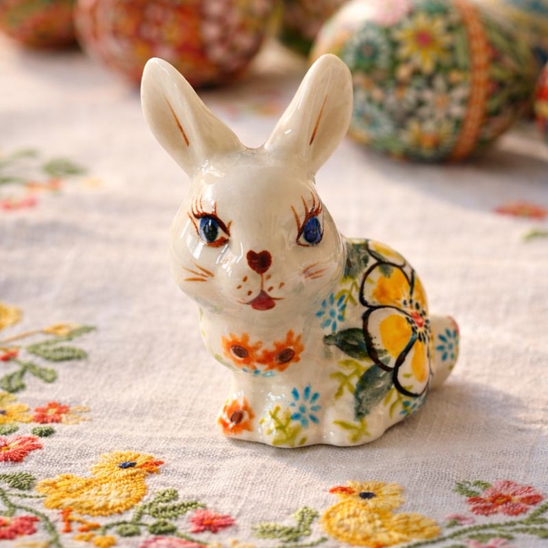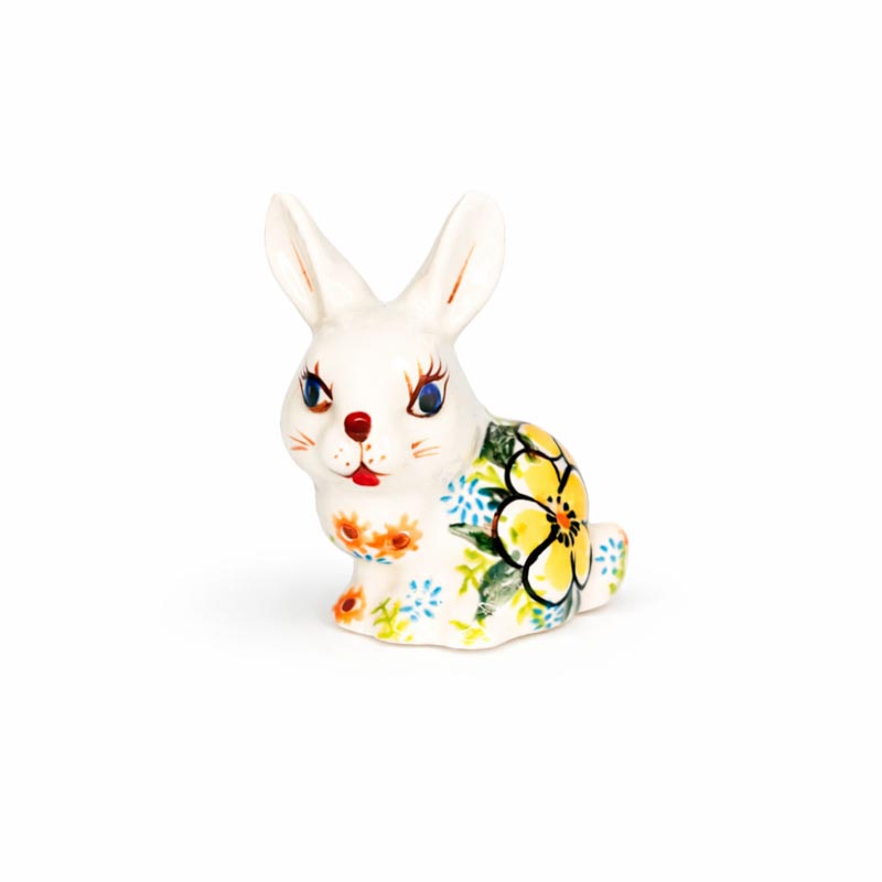 Piękna i ozdobna ozdoba na wielkanocny stół lub na parapet. Królik ceramiczny w malowane żółte kwiaty. Figurka wykonana z ceramiki bolesławieckiej.